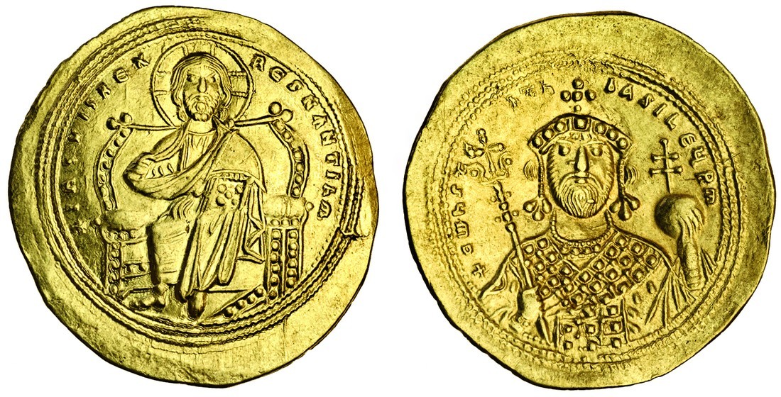 Constantine IX, Monomachus (AD 1042-1055), AV Histamenon, 4.40g, Constantinople, Christ enthroned facing, nimbate, right hand raised in benediction, holding book of Gospels in left hand, rev. crowned facing bust, holding cruciform sceptre with tendril-like ornament, and patriarchal cross on globe (DOC 1a; Sear 1828), extremely fine