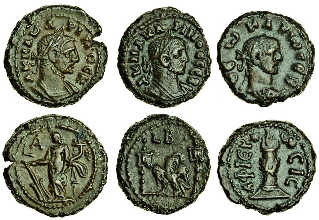 Carinus, Billon Tetradrachm, as Caesar, year 1 = 282/3, laureate, cuirassed bust right, rev. Fortuna standing left, holding rudder and cornucopia (BMC 2448; Köln 3172), another as Augustus, year 2 = 283/4, rev. eagle standing half left, head turned right, between two standards, LB above (Milne 4710), and another for Divus Carus, 283/4 or 284/5, laureate head right, rev. AIEPWCIC, lighted altar on base (BMC 2446; Köln 3167), all almost extremely fine (3)