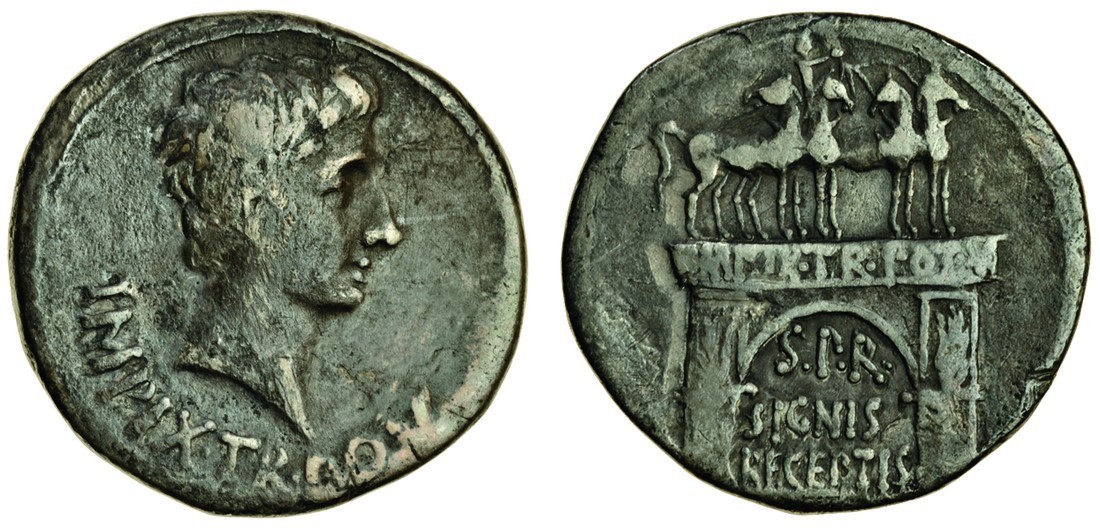 Augustus (27 BC-AD 14), AR Cistophorus, Pergamum, 19-18 BC, bare head right, IMP IX TR PO V, rev. IMP IX TR POT V on architrave of triumphal arch under which is S P R / SIGNIS / RECEPTIS (RIC 510; RPC 2218), toned, good fine