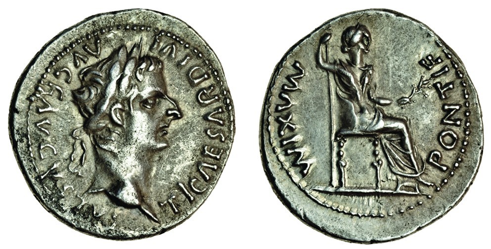 Tiberius (AD 14-37), AR Denarius, 3.81g, Lugdunum, after AD 16, laureate head right, rev. pontif maxim, female seated right holding sceptre and branch, chair legs ornamented, single line below (BMC 48; RIC 30), reverse slightly off-centre, good very fine