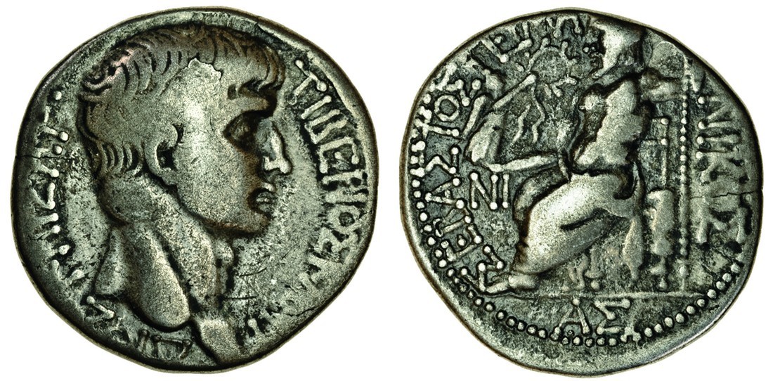 Claudius (AD 41-54), AR Tetradrachm, 13.94g, Antioch, bare head right, rev. Zeus seated left, holding Nike and sceptre, ni to left, a  in ex. (RPC 4116), flan crack at 9 o'clock on obverse, graffito before neck, good fine, rare