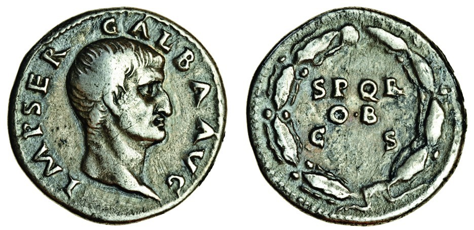 Galba (AD 68-69), Denarius, 3.26g, Rome, bare head right, rev. s.p.q.r. /o.b/c.s within oak-wreath (RIC 167 ; RSC 287), toned, marks in fields, very fine