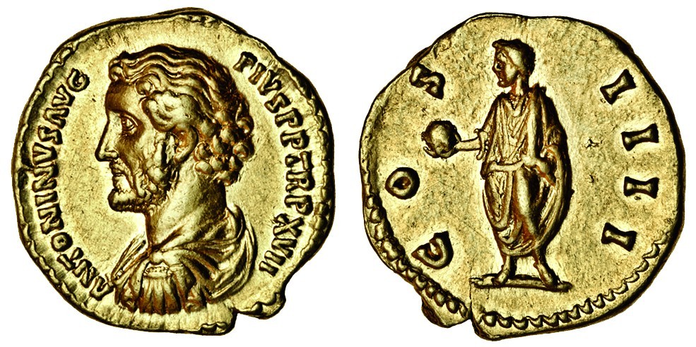 (x) Antoninus Pius (138-161), Aureus, 7.29g, 153/4, ANTONINVS AVG PIVS P P TR P XVII , draped and cuirassed bust left, rev. COS IIII, Antoninus, togate, standing left, holding globe and roll (RIC 233d; BMC 814; Calicó 1529), extremely fine, extremely rare