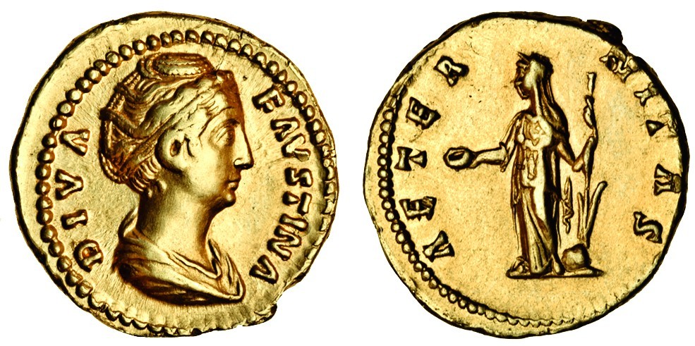 (x) Faustina Senior, wife of Antoninus Pius, Aureus,7.12g, Rome, 141-61, DIVA FAVSTINA draped bust right, rev. AETERNITAS Aeternitas, standing left, holding patera and rudder on globe (RIC 349a; BMC 371; Calicó 1743b), edge-mark, about extremely fine