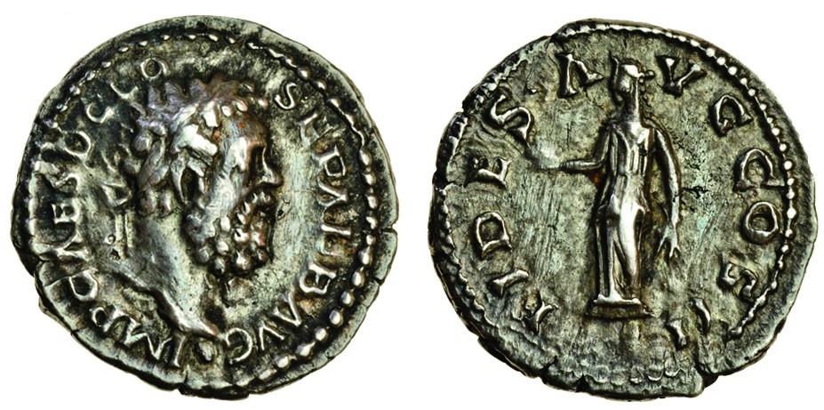 Clodius Albinus (late AD 195-19th Feb. 196), AR Denarius, 2.93g, Lugdunum, laureate head right, imp caes d clo sep alb avg, rev. Fides standing left, holding corn-ears and basket of fruit (RIC 17; BMC 282; RSC 20a), a few light scratches under tone, very fine, scarce