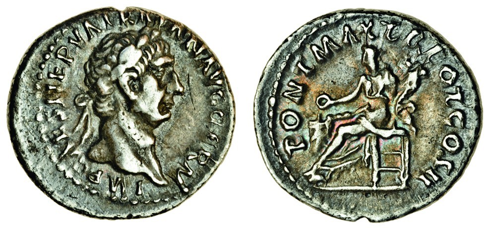 Trajan (AD 198-217), AR Denarius, laureate bust right, rev. PONT MAX TR POT COS II, Vesta seated left, holding patera over altar (sic) and cornucopia (RIC 21; RSC 288), cabinet tone, scratch before bust, very fine
