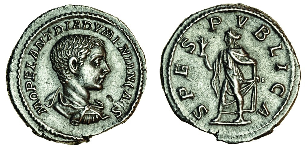 Diadumenian (217-18), as Caesar, Denarius, 2.85g, draped bust right, m opel ant diadvmenian caes, Spes walking left, holding flower and raising hem of skirt, spes pvblica (RIC 117; RSC 21a), toned, dig below chin, about extremely fine