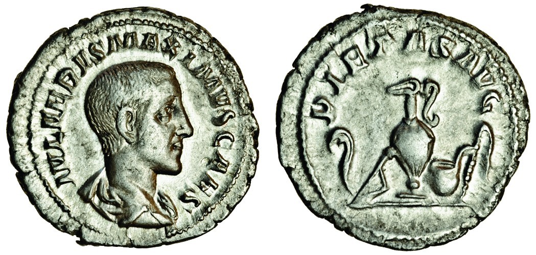 Maximus, Caesar (AD 235-238), AR Denarius, bare-headed, draped bust right, rev. PIETAS AVG, priestly implements- lituus, knife jug, simpulum and sprinkler (RIC 1; RSC 1), almost extremely fine