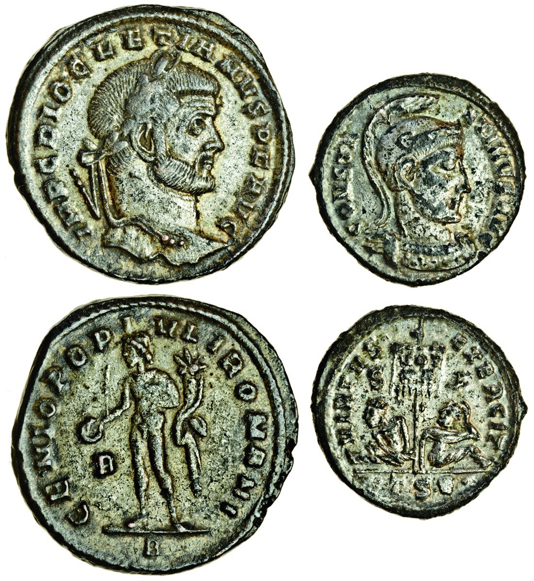 Diocletian (AD 284-305), AE Follis, Heraclea, laureate head right, rev. GENIO POPVLI ROMANI, Genius standing left, and a Follis of Constantine I (307-337), Thessalonica, helmeted, cuirassed bust right, rev. VIRTVS EXERCIT, two captives bound and seated either side of standard inscribed VOT XX, both silvered and almost extremely fine (2)