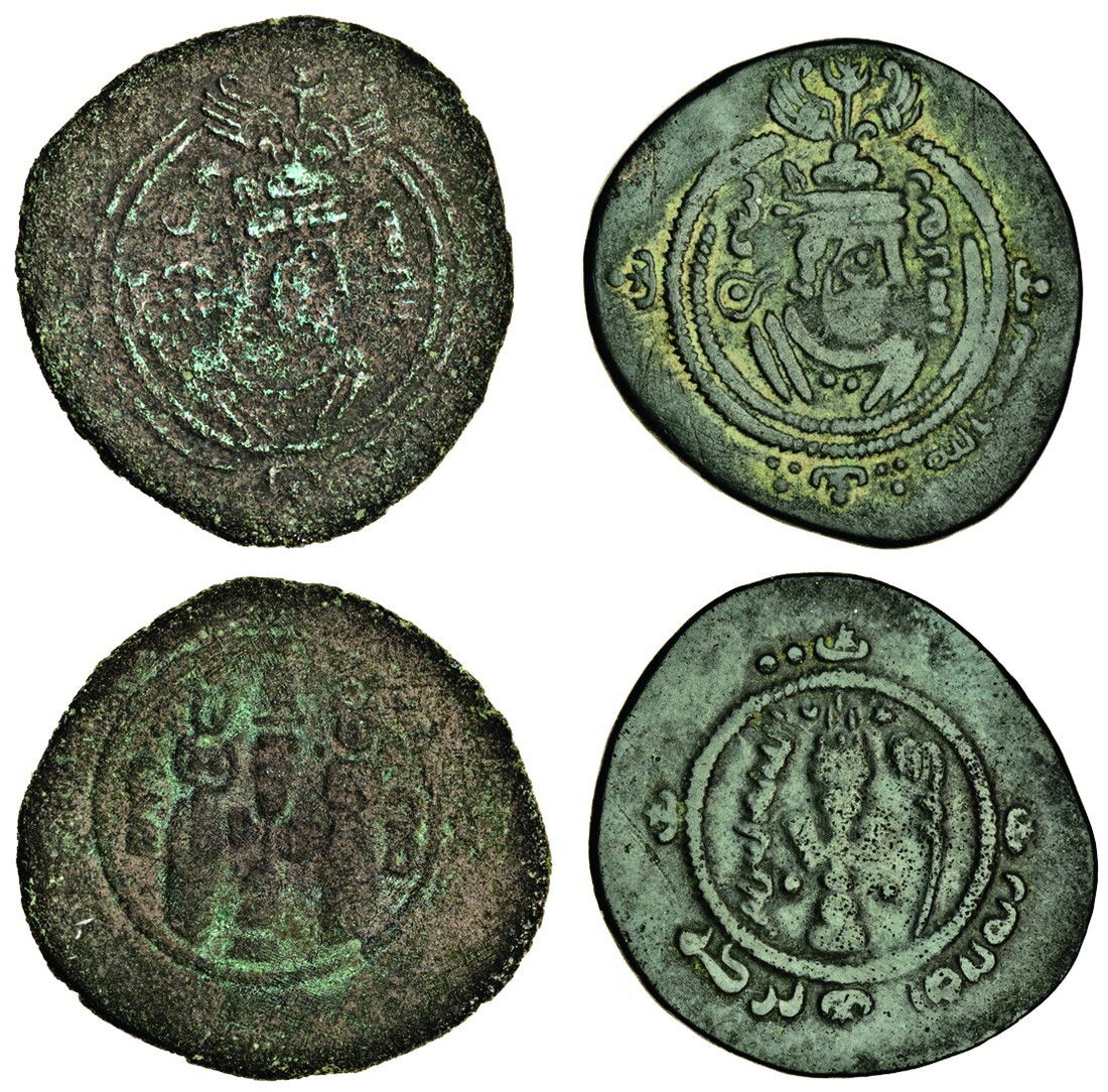 (x) Arab-Sasanian, Anonymous (late 7th century), AE Pashiz, 3.27g, DA (Darabjird), yr.68 of the post-Yazdigerd era, Sasanian bust right, bismillah in margin, rev. fire altar with abzud baraka (has increased benediction) in margin (Gyselen p.127, type 10b; A.45.1); together with another AE Pashiz of similar type, mint and date unclear, the first good fine, scarce, the second corroded, very good (2)