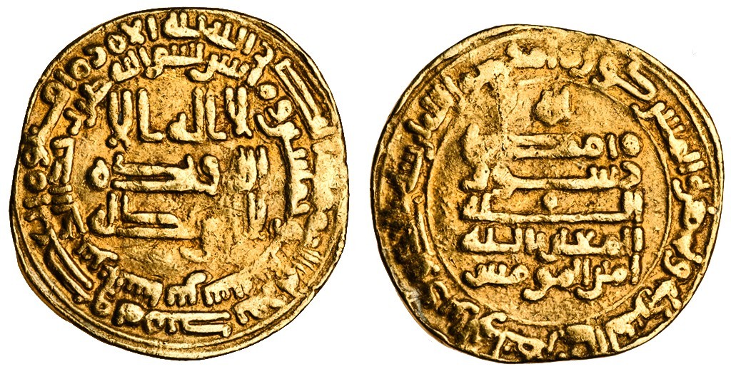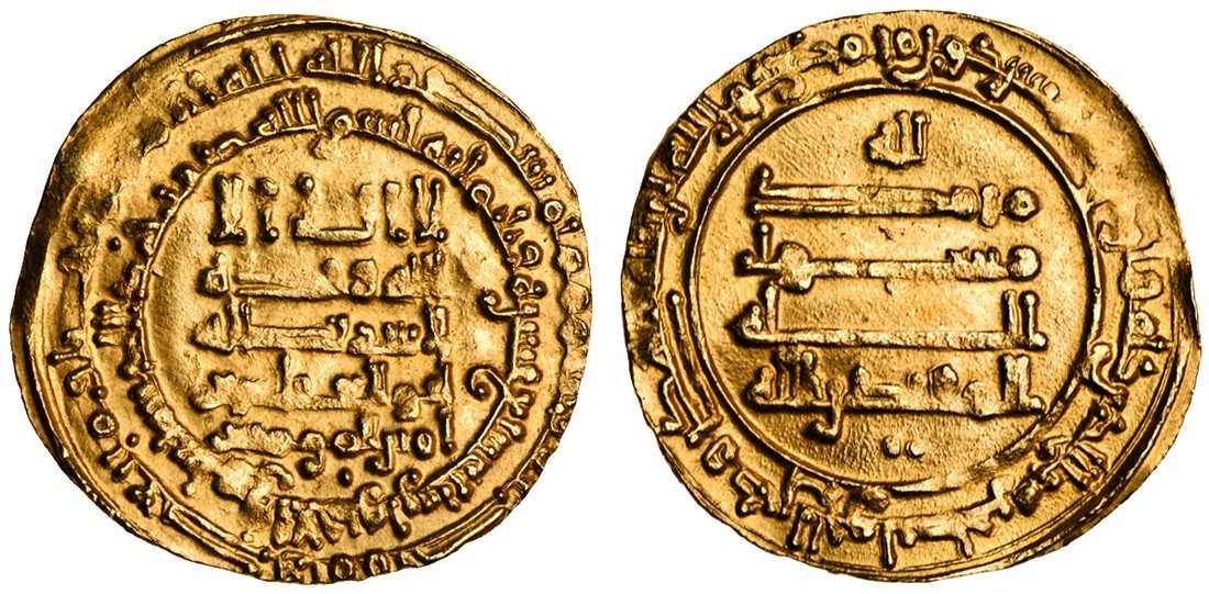 (x) Abbasid, al-Mu'tazz (866-69), AV Dinar, 4.01g, al-Shash, AH253; al-Muqtadir, AV Dinar, 3.75g, Suq al-Ahwaz, AH317, naming Abu'l 'Abbas below legend (Bernardi 162Qf, 242Nf; A.A.235.1, 245.2), the second possibly ex-mount, fine and very fine (2)