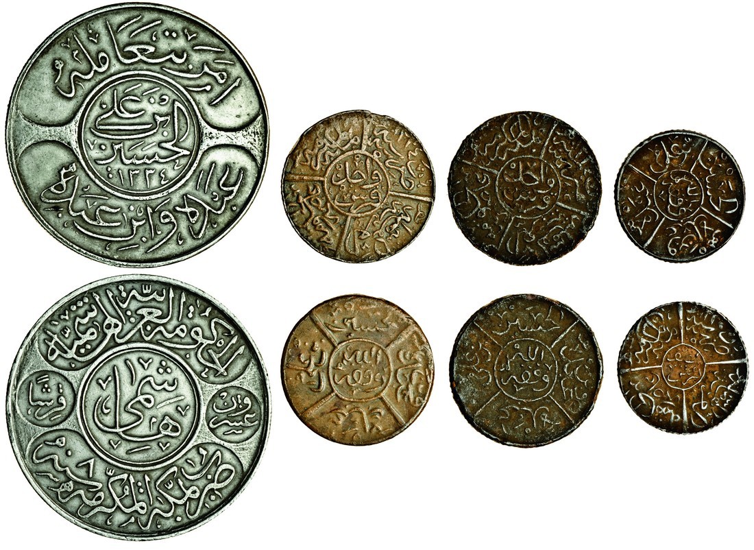(x) Al-Hejaz, al-Husayn bin 'Ali, 20-Qurush (Riyal), AH1334, yr.8, AE Qurush (2), ½-Qurush, AH1334, yr.5 (2), milled and plain edge types, all Makka al-Mukarrim, (KM. 23, 24, 30), generally very fine (4)