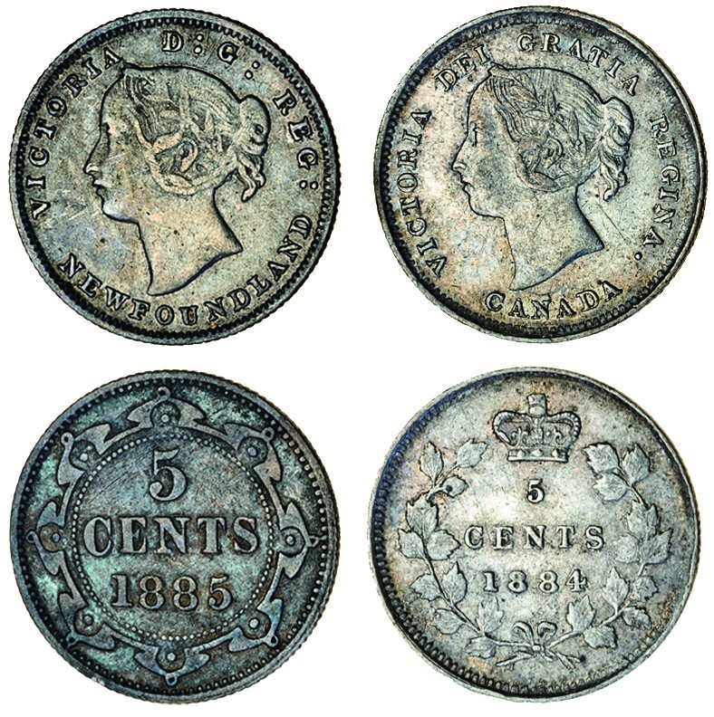 Canada, Victoria (1836-1901), 5-Cents, 1884 (KM.2), Newfoundland, 5-Cents, 1885 (KM.2), very fine (2)