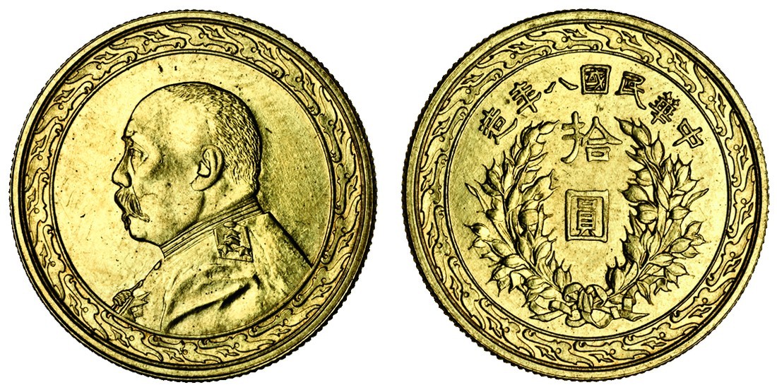 (g) China, Republic 10-Yuans, Year 8 (1919), bust of President Yuan Shi Kai left, rev. legend and wreath (F.5; KM.330), traces of brilliance, good extremely fine