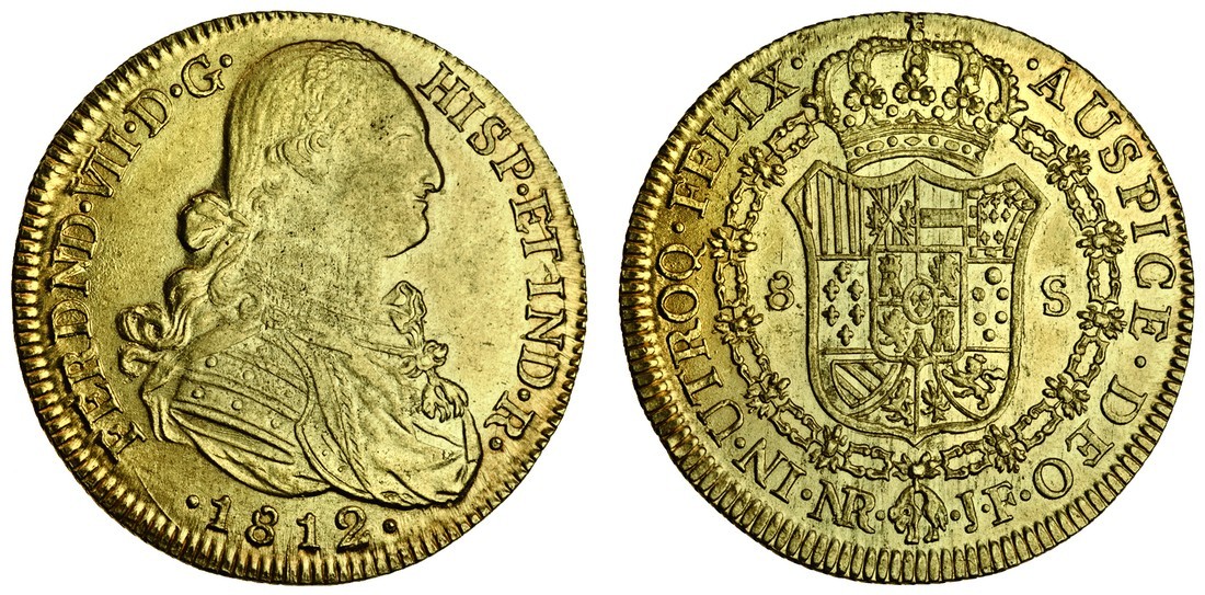 (g) Colombia, Ferdinand VII (1808-24), 8-Escudos, 1812 NR, armoured and draped bust right, rev. crowned arms with Golden Fleece collar (F.60; KM.66.1), edge bruise at 8 o'clock on reverse, about extremely fine