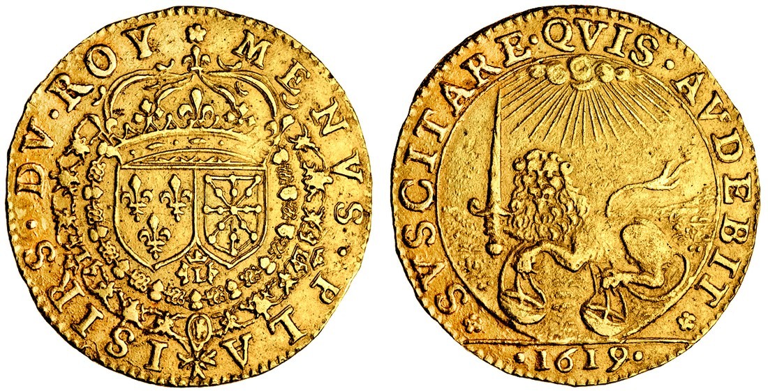 France, Conseil du roi, Conjuration de Venise, gold jeton, 1619, crowned shield, rev. svscitare qvis avdebit, lion seated holding sword and scales, date below, 9.31g, 27mm. (Feu.122), from a mount, good very fine, extremely rare in gold