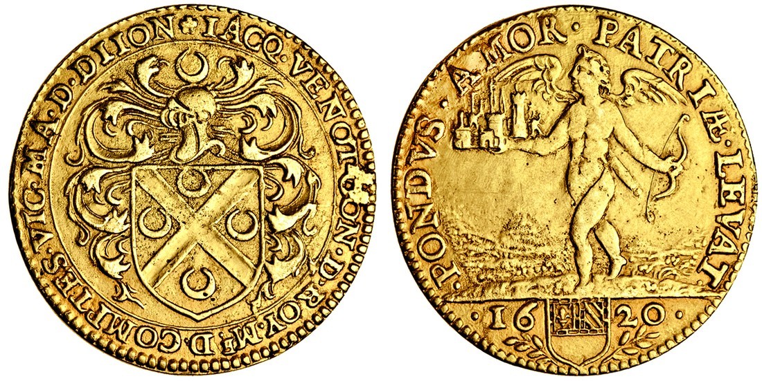 France, Jacques Venot, Maire de Dijon, gold jeton, 1620, iacq venot con d royme d comptes vic ma d diion, arms of Venot, rev. pondvs amor patriae levat, Cupid walking, holding bow in his left hand and the city of Dijon in his right hand, shield of Dijon dividng date in exergue, 11.53g, 27.5mm. (Amanton pl.V no.48), from a mount, good very fine, extremely rare in gold