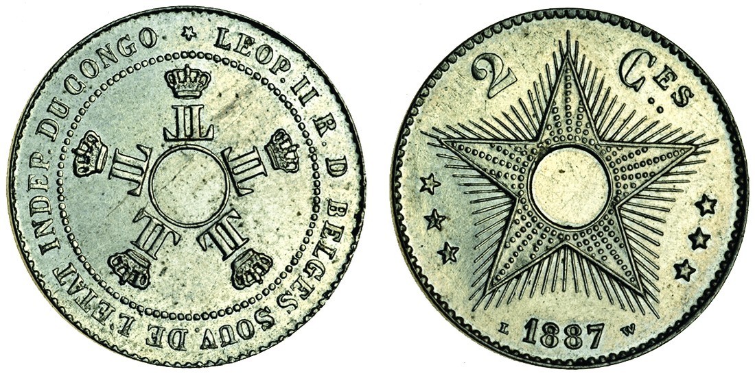 (x) Congo Free State, Leopold II of Belgium, Royal Domain (1865-1908), pattern 2-Centimes, 1887, in nickel, 3.96g, crowned monograms around central circle, leop. ii r. d. belges souv. de l'etat indep. du congo, five-pointed star with rays, three smaller stars at sides, above, 2 Ces, below, date, lw by the date, edge, milled, coin alignment, central part not holed, smaller diameter, 22.1mm. (Dupriez 48; cf KM.Pn1), some carbon spots, light marks in fields, uncirculated, very rare