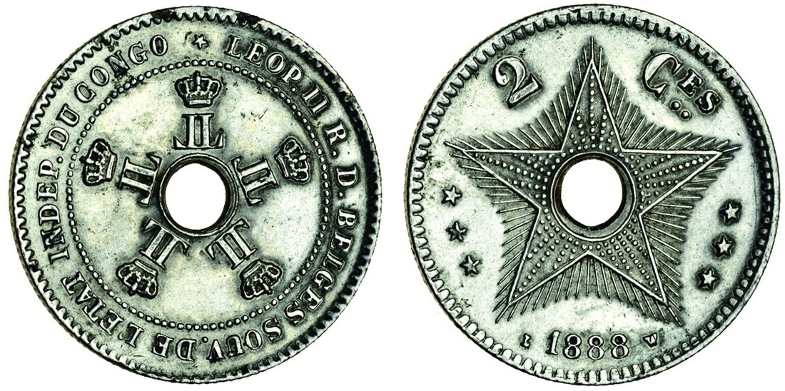 (x) Congo Free State, Leopold II of Belgium, Royal Domain (1865-1908), 2-Centimes, 1888, struck in nickel (or copper-nickel?), 4.12g, crowned monograms around central hole, leop. ii r. d. belges souv. de l'etat indep. du congo, five-pointed star with rays, three smaller stars at sides, above, 2 Ces, below, date, lw by the date, edge, milled, coin alignment (Dupriez 47; KM.Pn9), edge knocks, scratches, verdigris on obverse, good very fine