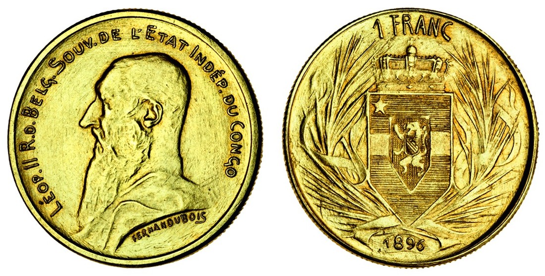 (x) Congo Free State, Leopold II of Belgium, Royal Domain (1865-1908), pattern Franc, 1896, in gold, 7.27g, draped bust left, fernan dubois below, rev. crowned shield within palm wreath, value above, date below, edge, milled, coin alignment (Dupriez 111; KM-, not listed in gold), uncirculated, extremely rare
