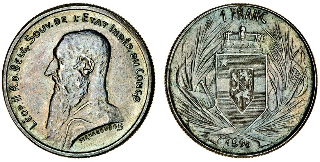 (x) Congo Free State, Leopold II of Belgium, Royal Domain (1865-1908), pattern Franc, 1896, in silver, 4.57g, draped bust left, fernan dubois below, rev. crowned shield within palm wreath, value above, date below, edge, milled, coin alignment (Dupriez 112; KM.-, not listed in silver), toned, friction on the highpoints, uncirculated, extremely rare