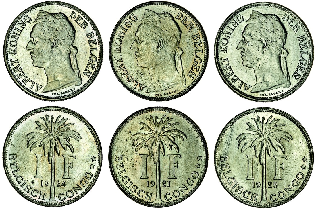 (x) Belgian Congo, Albert I of Belgium (1909-34), Franc (10), 1920, 1921, 1922, 1923, 1923 3 over 2, 1924, 1925, 1926, 1928, 1929, laureate head left, albert koning der belgen, rev. palm tree dividing value, date and legend, belgisch congo, two stars after legend (Dupriez 187, 200, 210, 217, 226, 235, 255, 266; KM.21), fine to about uncirculated (10)