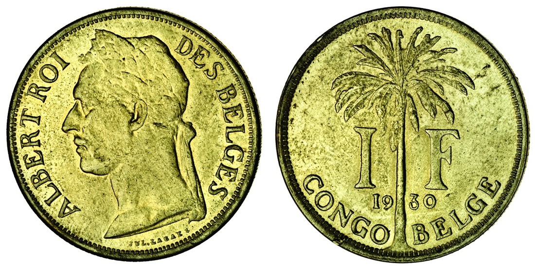 (x) Belgian Congo, Albert I of Belgium (1909-34), pattern Franc, in light bronze, 1930, 8.92g, laureate head left, albert roi des belges, rev. palm tree dividing value, date and legend, congo belge, edge milled, coin alignment, normal flan, (Bogaert - cf 267 B3 in copper; Dupriez-; KM.-), remains of lustre, raised flake of metal on rim at 7 o'clock on reverse, dig in tie, friction on the highpoints, uncirculated
