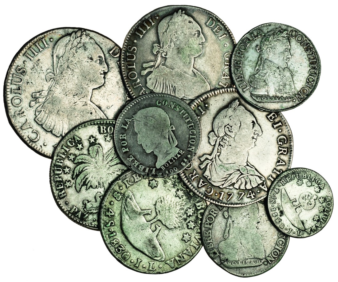 Bolivia, silver coins (9), 8-Reales, 1818, 4-Reales (2), 1774, 1804, 4-Soles, 1830 over 27, JL, 2-Soles (3), 1830 JL (2), 1862 FP, Sol, 1830 JL, all Potosi, and 4-Soles 1854 F, La Paz, some traces of mounts, fine to very fine (9)