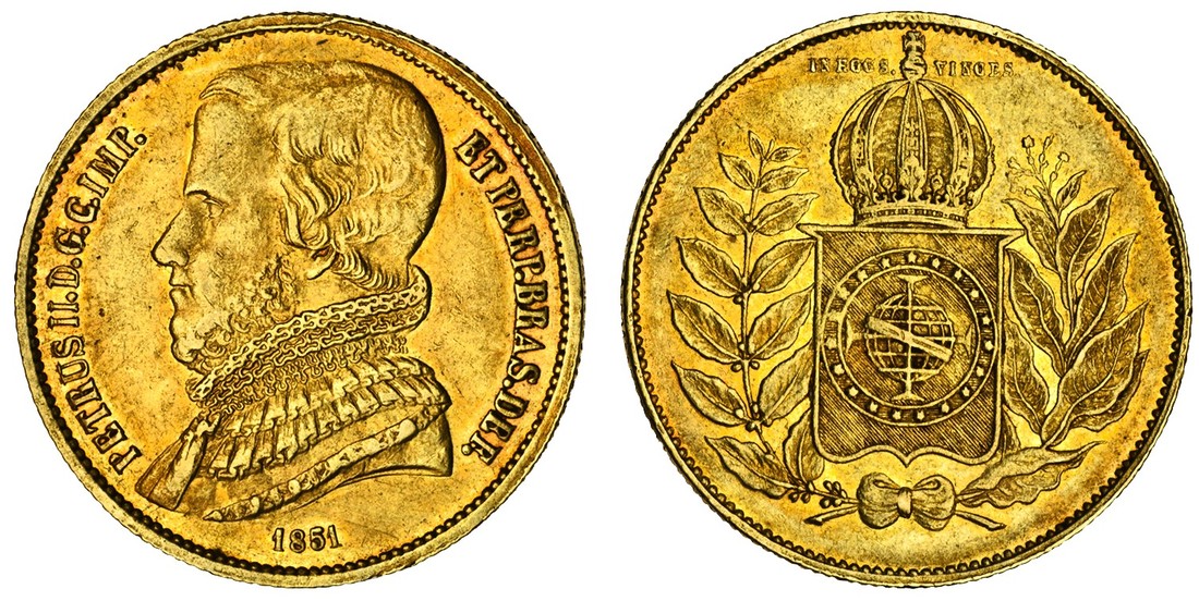 (g) Brazil, Pedro II (1832-89), 20,000-Reis, 1851, bust in coronation robes with ruff collar left ('Papo de Tucano'), rev. crowned shield in wreath (F.119; KM 461), good very fine