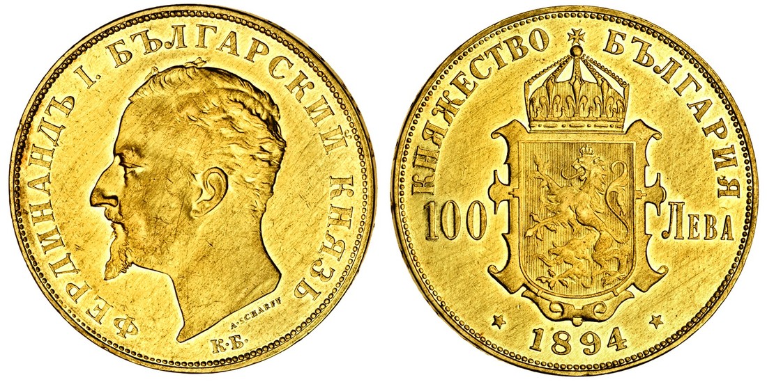 (g) Bulgaria, Ferdinand I (1887-1908), 100-Leva, 1894 kb, head left, rev. crowned arms dividing value (F.2; KM.21), cleaned, marks on edge, remains of lustre around design, scratches to face, good very fine