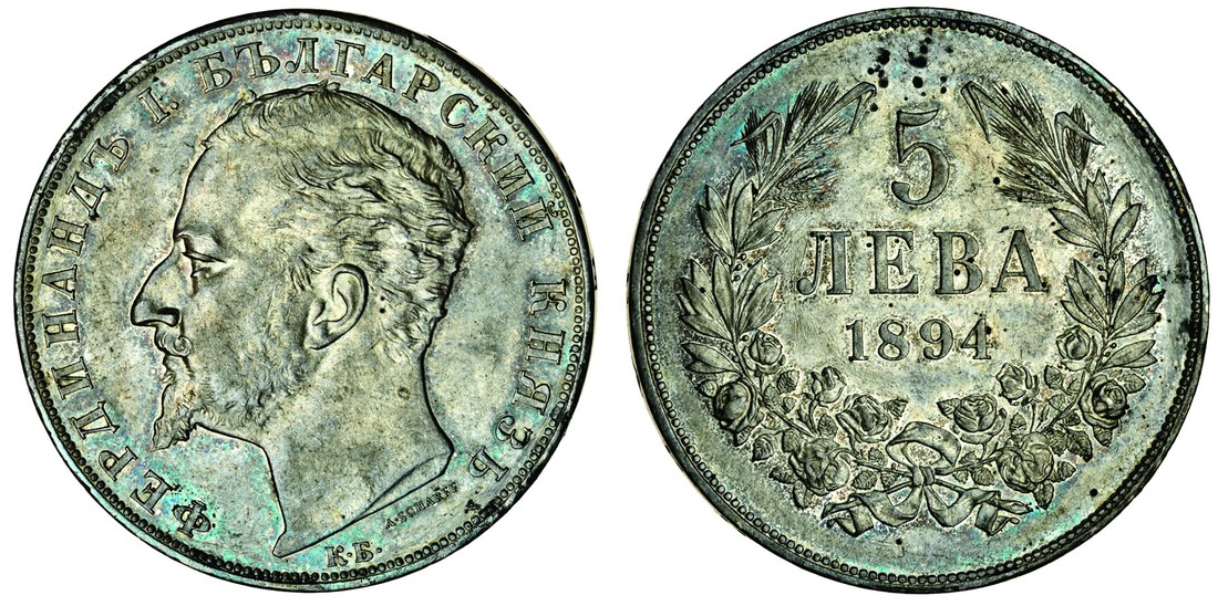 (x) Bulgaria, Ferdinand I (1887-1908), 5-Leva, 1894 kb, head left, rev. value and date within wreath (Dav.61; KM.18), brilliance, toned, dark stains on rim, spots on reverse, marks to face, good extremely fine