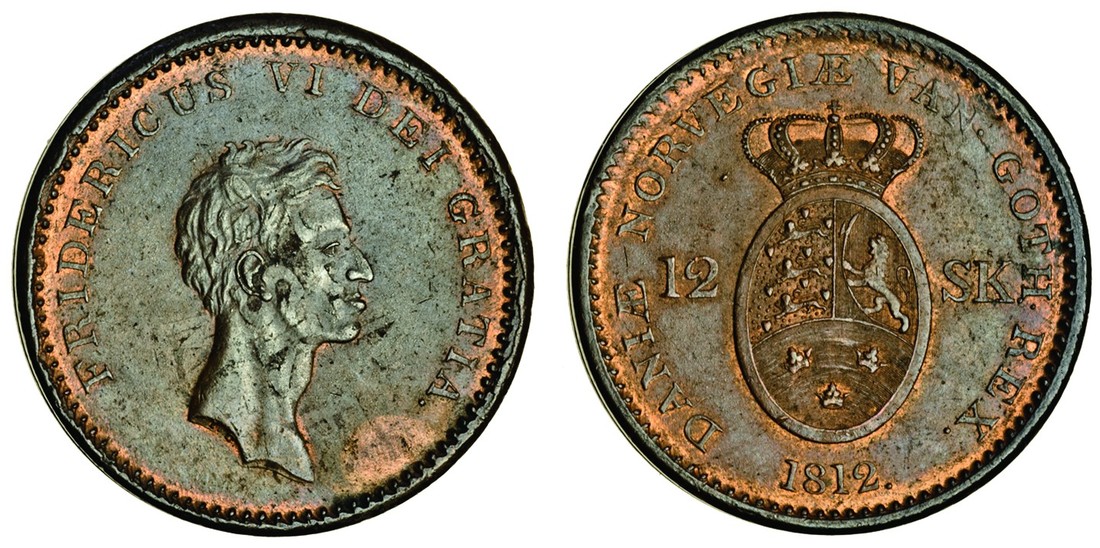 Denmark, Frederik VI (1808-39), AE 12-Skilling, 1812 i c, Copenhagen, head right, rev. crowned oval shield, overstruck on an earlier Skilling, visible on obverse (KM 673.1), extremely fine with lustre around the details