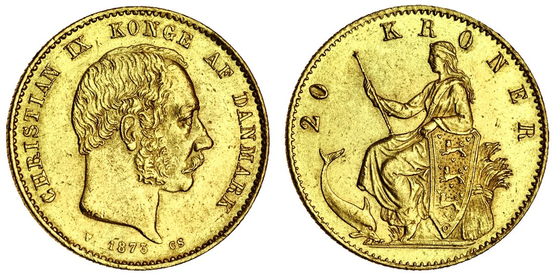 (g) Denmark, Christian IX (1863-1906), 20-Kroner, 1873 CS, head right, rev. seated figure with shield and dolphin (and dolphin (F.295; KM.791.1), some edge knocks, dent on forehead, very fine
