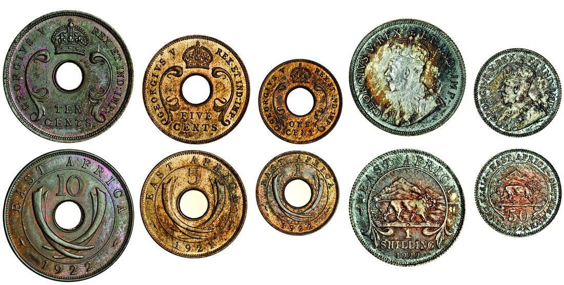 (x) East Africa, George V (1910-36), Mint Set, 1921/1922, Shilling, 1922H, 50-Cents, 1922, 10-Cents, 1922, 5-Cents, 1921, and Cent, 1922H (KM.MS1), the silver very darkly toned, the 10-Cent dark but lustrous, the 5-Cent and Cent patchy but with some brilliance, in plum coloured east african currency board 1922 case of issue, rare