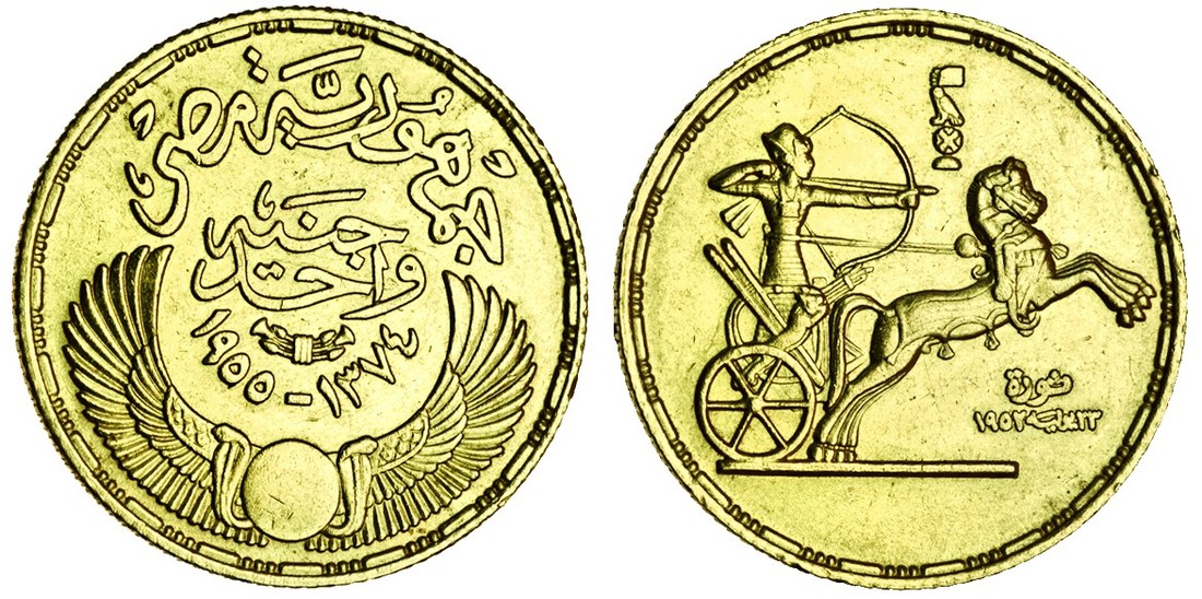 (x) Egypt, First Republic (1953-58), gold Pound, 1955, on the 3rd anniversary of the Revolution, inscription, rev. chariot (F.40; KM 387), extremely fine