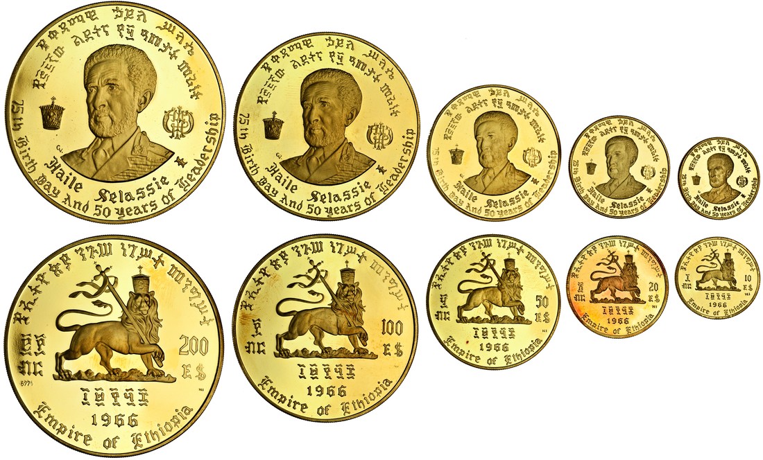 (g) Ethiopia, Haile Selassie I (1930-36, 1941-74), gold proof Set commemorating Haile Selassie's 75th birthday and 50 years of leadership, 1966, 200-, 100-, 50-, 20-, 10-Dollars, in green cloth presentation case (KM. PS2), uncirculated, as struck (5)