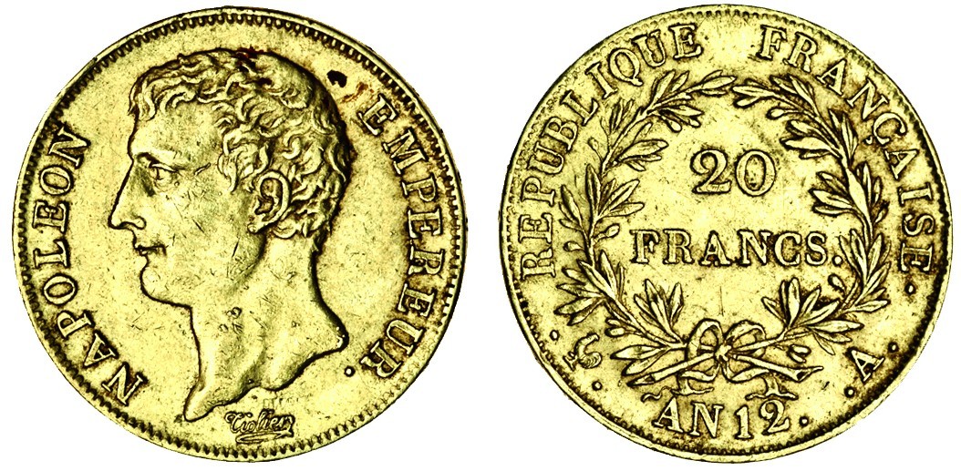 (g) France, Napoleon as Emperor (1804-14), 20-Francs, AN 12 A, Paris, head left, rev. value in wreath (F.487; KM 651), very fine