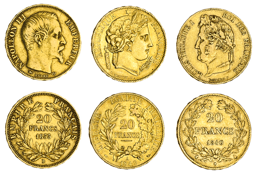 (g) France, 20-Francs (3), 1840 A, 1849A, 1855D (F.560, 566, 575), very fine (3)