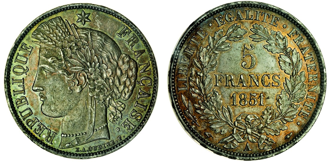 France, Second Republic (1848-51), silver 5-Francs, 1851 A, Paris, head of Ceres left, rev. value and date within wreath (GAD.; KM.761.1), toned, in CGS holder graded UNC 85
