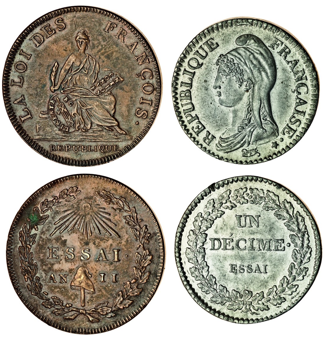 France, Convention, pattern Decime, in bronze, by Bernier, An II (1793), 23.70g, Republic seated, holding plume and tablets, la loi des françois, republique in exergue, rev. essai an ii, radiate sun above, hat on a stick below, within oak wreath, 23.74g, on a 34.5mm flan, 3.3mm thick, edge plain (cf VG 412 listed with raised edge), light scratches, spot of verdigris, extremely fine, Directoire, pattern Decime, in white metal, draped bust of Republic left, republique française, Dupre below, rev. un decime essai within oak wreath, 27.55g, on a 31.7mm flan, 3.8mm thick, edge plain (VG -), edge knock at 11 o'clock, extremely fine, (2)