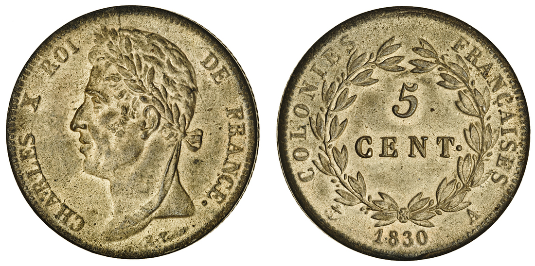 French Colonies, Charles X (1824-30), AE 5-Centimes, 1831 a, Paris, laureate head left, rev. value in wreath (KM 10.1), extremely fine, with lustre