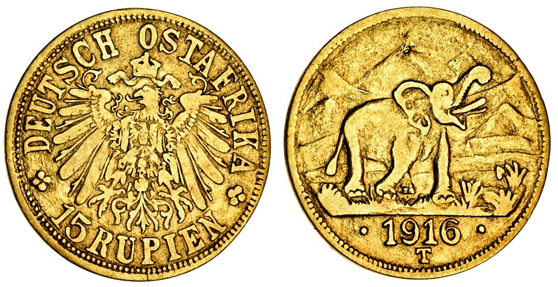 (g) German East Africa, 15-Rupien, 1916T (Tabora), eagle, arabesque below a, rev. elephant (F.1; KM 16.2), scratches above elephant, fine