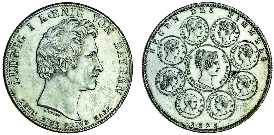 (x) Germany, Bavaria, Ludwig I (1825-48), Taler, 1828, head right, rev. portraits of the Queen and her eight children (Dav.563; KM.734), dent above eye, remains of green residue, about extremely fine