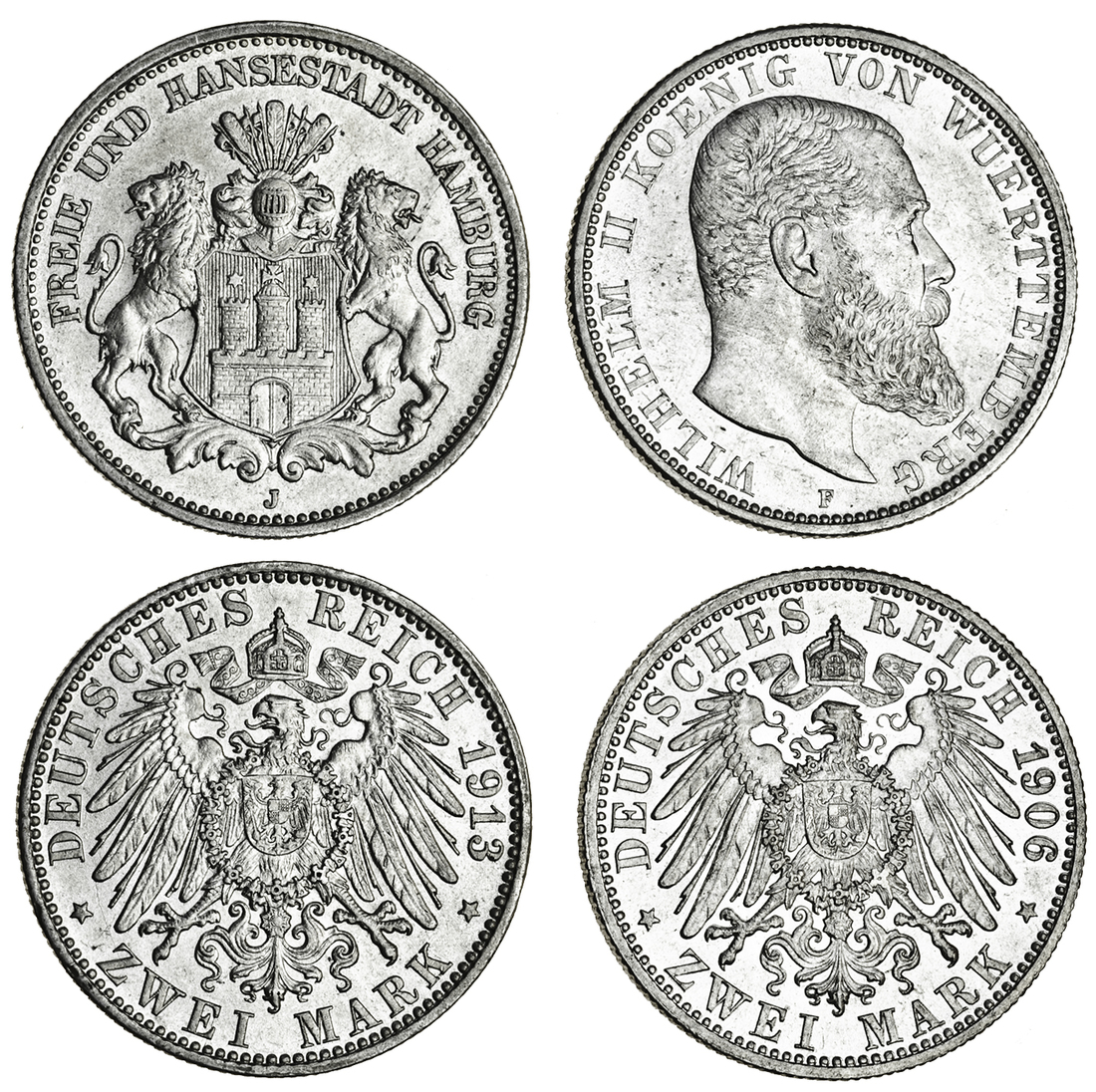 Germany, Hamburg, 2-Mark, 1913 J, Württemberg, 2-Mark, 1906 F (KM 294, 631), both good extremely fine (2)