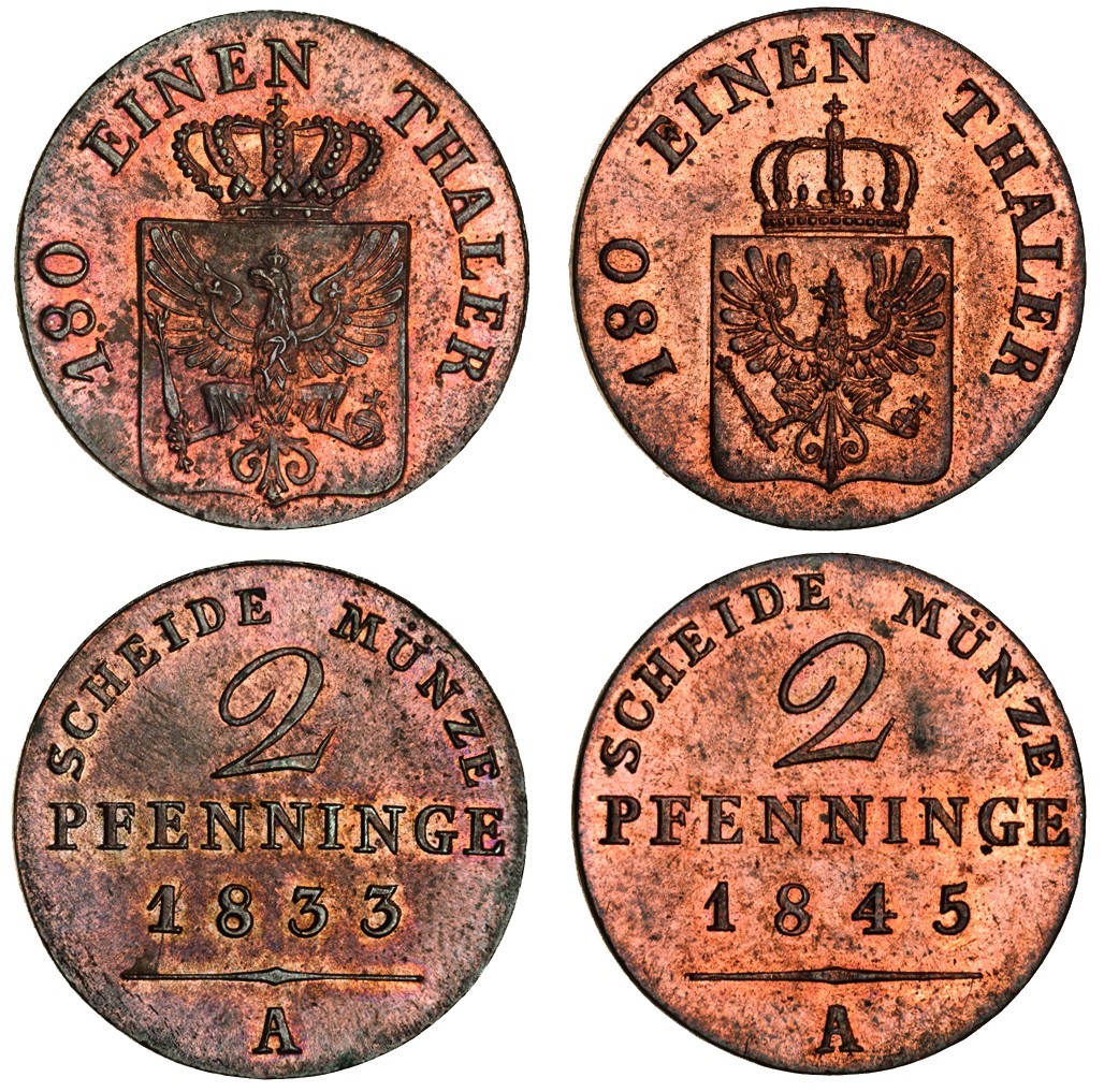 Germany, Prussia, Friedrich Wilhelm III (1797-1840), 2-Pfennig, 1833A, Friedrich Wilhelm IV, 2-Pfennig, 1845A (KM 406, 448), both uncirculated with lustre (2)