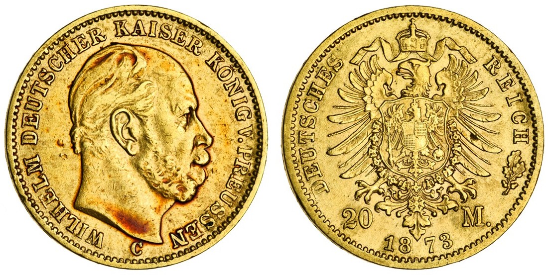 (g) Germany, Prussia, Wilhelm I (1861-88), 20-Marks, 1873 C, Frankfurt, head right, rev. eagle (F.3815; KM 501), very fine
