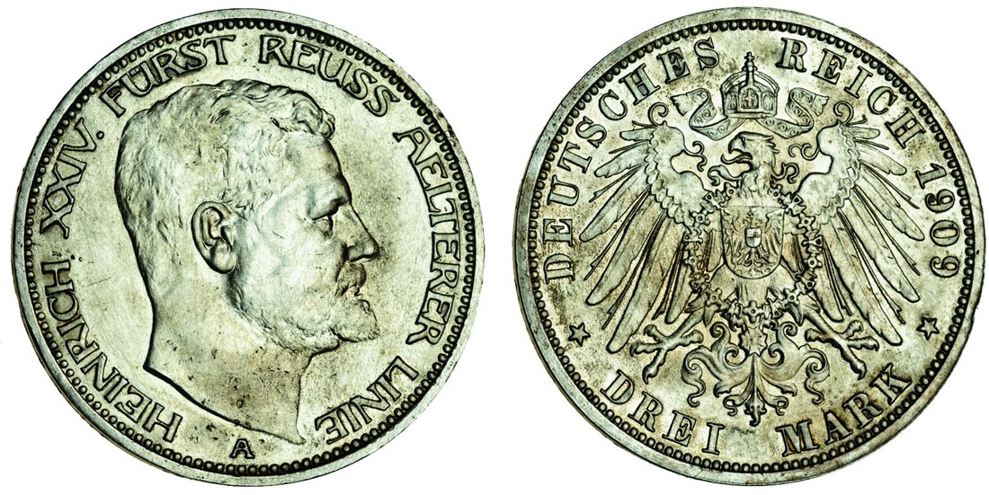 (x) Germany, Reuss-Obergreiz, Heinrich XXIV (1902-18), 3-Marks, 1909 A, head right, rev. crowned eagle (KM.130), hairlines, marks to face and neck, extremely fine