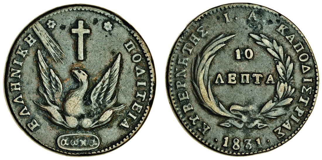 Greece, Republic, John Capodistrias (1828-31), 10-Lepta, 1831, phoenix, rev. value in wreath (KM.12), fine