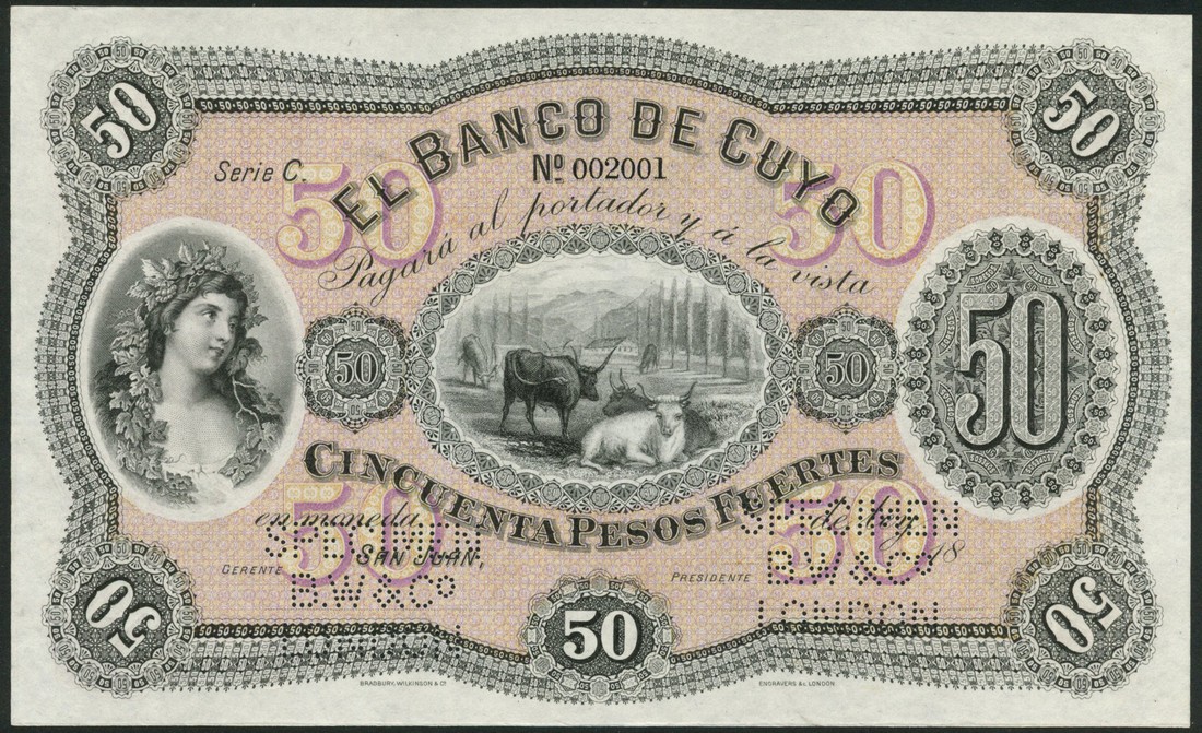 (†) El Banco de Cuyo, Argentina, specimen 50 pesos fuerte, San Juan, 18- (1892), black and pink and mauve, maiden with vine leaf laureate at left, cattle at centre, value in field reverse orange, blue and mauve, medallic female heads and value in field