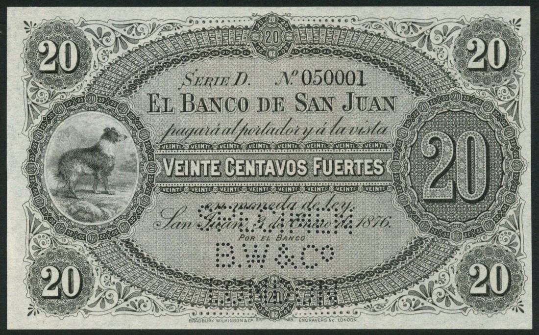 (†) El Banco de San Juan, Argentina, specimen 20 centavos fuertes, 3 January 1876, serial number D 050001, black and grey, sheep dog at left, value at right, reverse red and blue, head of Libery at centre, value at left and right